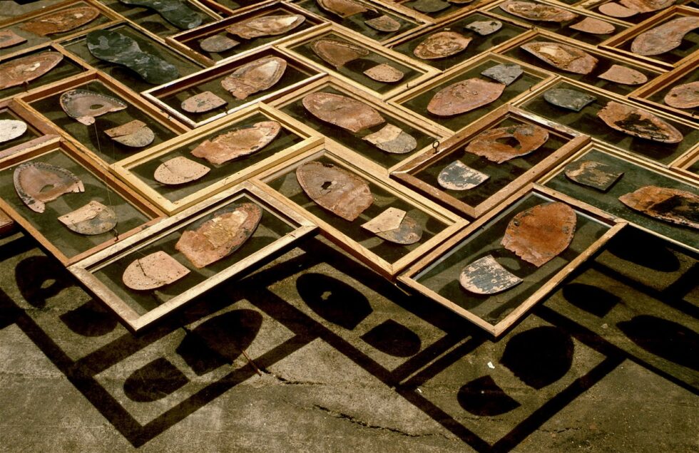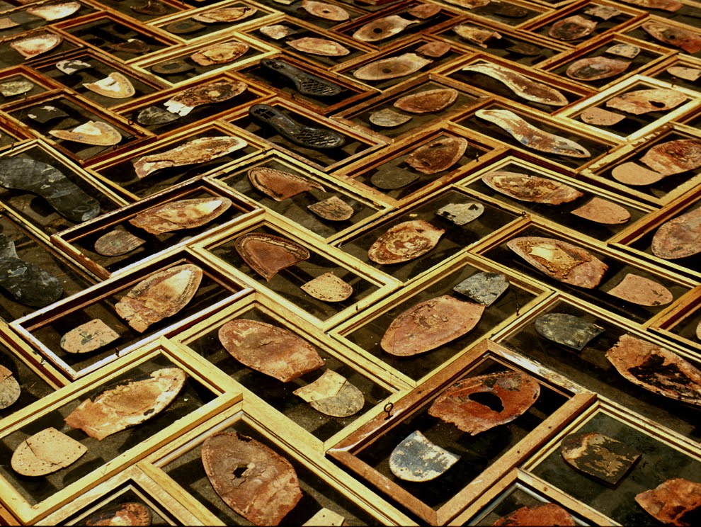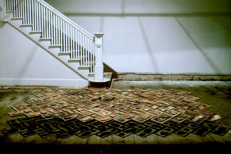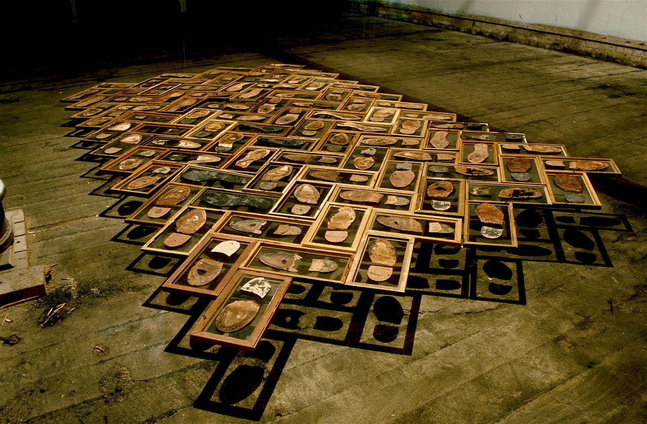 Soles was exhibited in 2001 at the Accessibility Sumter invitational installation event. Ninety six wooden picture frames, each holding a pane of glass and an old shoe sole, were attached together in a herringbone pattern and suspended from monofilament line. Soles was 7 x 13’ and hung 1 ft. off the floor. The shadows of the shoe soles can be seen on the floor beneath.