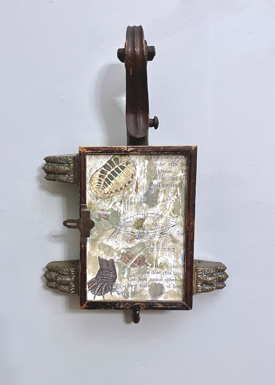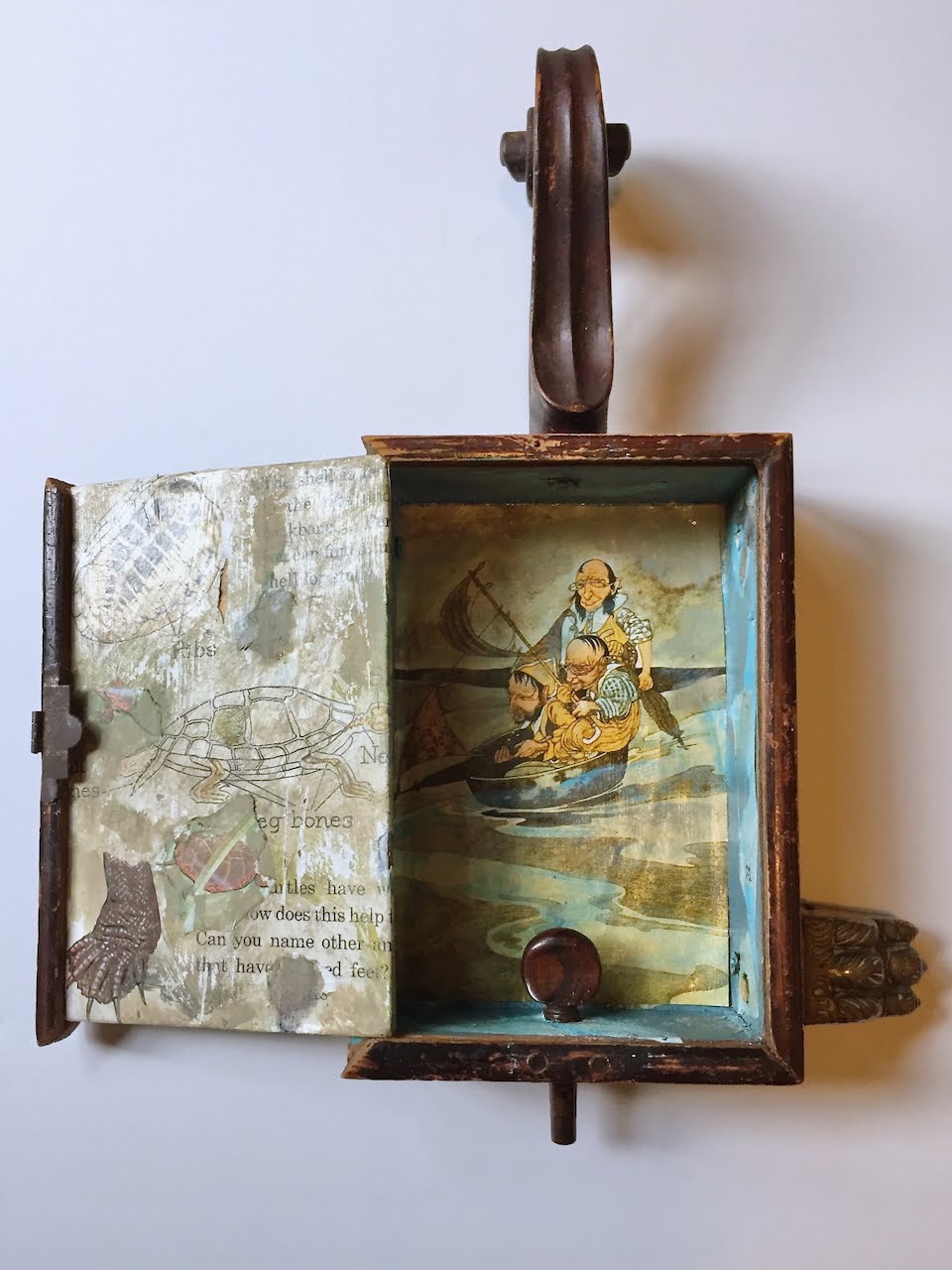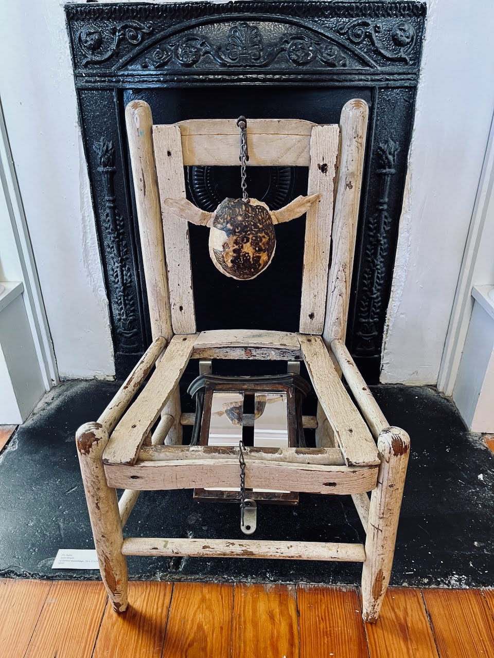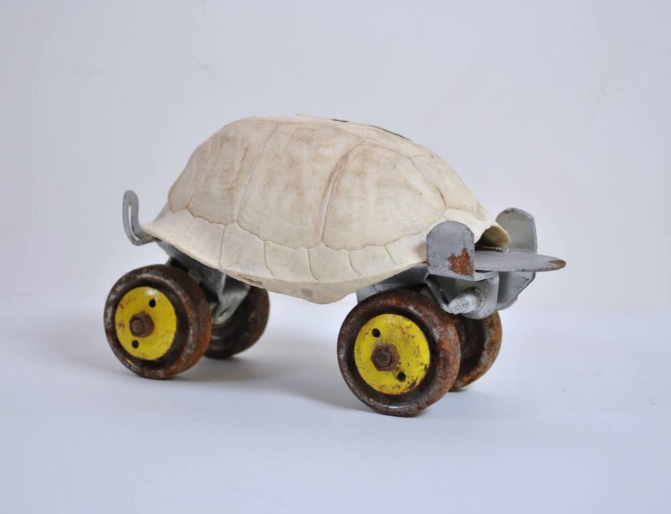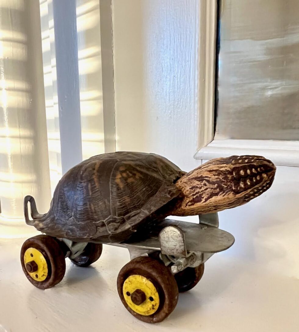 Turtle Travails was a group exhibition at No. 3 Pottery, Simpsonville, SC, 2024. The gallery space was in an old house with an ornate hearth and mantle that was used for the installation. In Fly Turtle the split mirror beneath the seat of the child's chair reflects either the turtle “flying” or the viewer looking within. The framed mirror moves up and down adjusting to different viewing perspectives. Turtle Racers on the mantle above add more possiblities for movement.